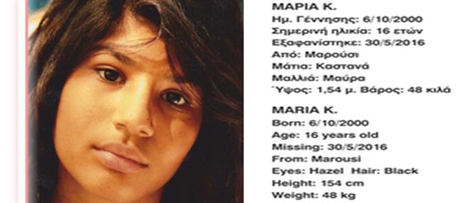 H Μαρία Κ. γεννήθηκε στις 6 Οκτωβρίου του 2000, έχει μαύρα μαλλιά και καστανά μάτια και εξαφανίστηκε στις 10:00 το βράδυ από το σπίτι της στην περιοχή του Αμαρουσίου.