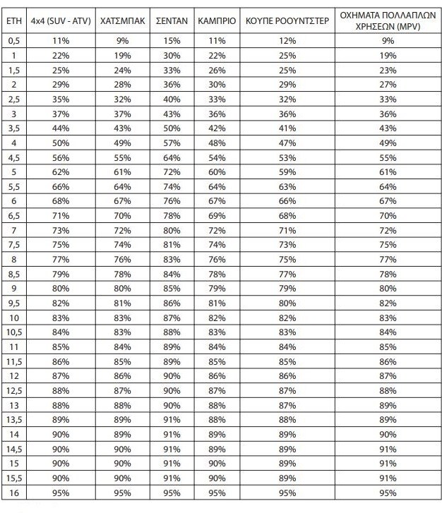 Οι συντελεστές απομείωσης των τιμών είναι οι ίδιοι με εκείνους που ισχύουν σήμερα και διαχωρίζονται σε πέντε κατηγορίες που περιλαμβάνουν 4Χ4, Hatchback (5θυρα-3θυρα), Σεντάν (4θυρα), Κάμπριο, Κουπέ-Ρόουντστερ και Οχήματα Πολλαπλών Χρήσεων (MPV).