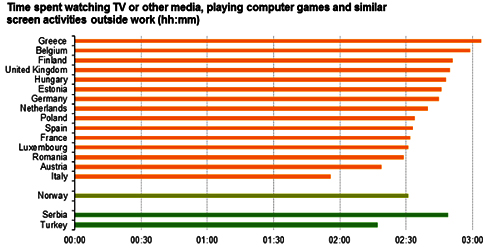 Η Ελλάδα είναι η μόνη ευρωπαϊκή χώρα όπου ο χρόνος αυτός ξεπερνά ημερησίως τις 3 ώρες. Ακολουθούν το Βέλγιο (2.59 ώρες), η Φινλανδία (2.51) και το Ηνωμένο Βασίλειο (2.50).