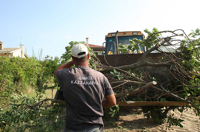 Η πρώτη μπουλντόζα, μετά την τραγωδία με τους δεκάδες νεκρούς από τη φωτιά στην ανατολική Αττική, βγήκε στην Κασσάνδρα Χαλκιδικής, το πρωί.