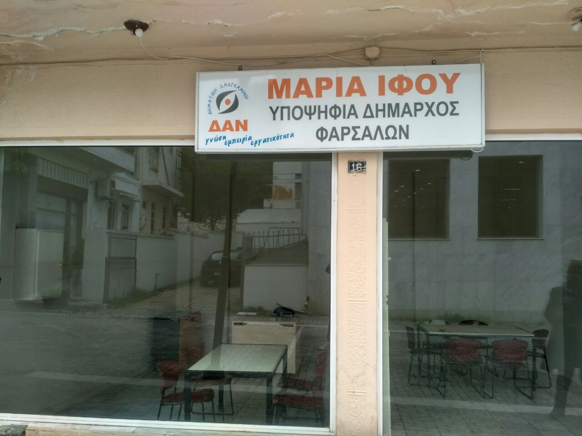 Το προεκλογικό της κέντρο στον πεζόδρομο της Πατρόκλου άνοιξε κι επίσημα η υποψήφια δήμαρχος Φαρσάλων Μαρία Ίφου.