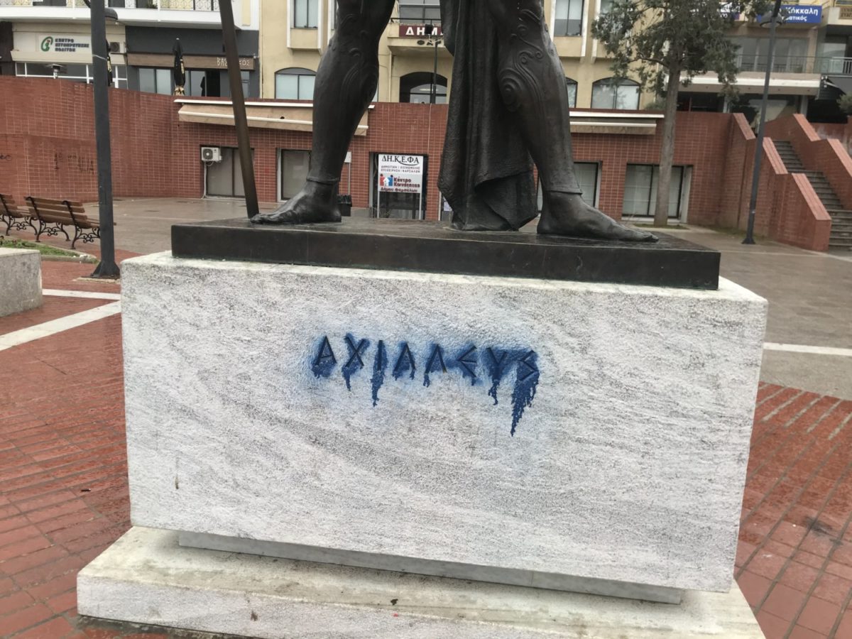 Άγνωστοι βεβήλωσαν με μπογιά την επιγραφή του ονόματός του ηρωικού Αχιλλέα στα Φάρσαλα, στη βάση του αγάλματος, στην πλατεία δημαρχείου.