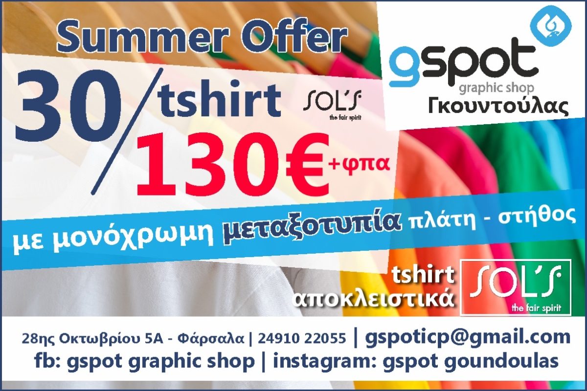 Το “gspot” graphic shop ΓΚΟΥΝΤΟΥΛΑΣ στα Φάρσαλα έρχεται με καλοκαιρινή προσφορά 30 tshirt με 130 ευρώ + ΦΠΑ της sol’s, με μονόχρωμη μεταξοτυπία πλάτη – στήθος.