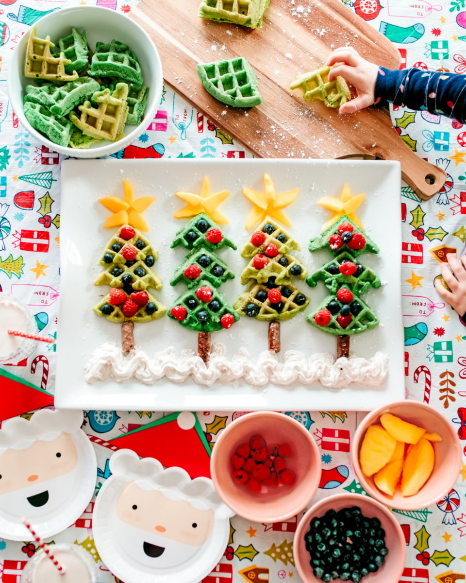 Απλά προσθέστε στο μείγμα για βάφλες που φτιάχνετε συνήθως αβοκάντο λιωμένο ή σπανάκι ή πράσινο χρώμα ζαχαροπλαστικής, κόψτε τα τριγωνάκια και αφήστε τα παιδιά σας να συνθέσουν υπέροχα χριστουγεννιάτικα δέντρα στιβάζοντας το ένα τριγωνάκι πάνω από το άλλο και διακοσμώντας τα με διάφορα φρούτα, μαρμελάδα και ό,τι άλλο τραβάει η όρεξή τους!