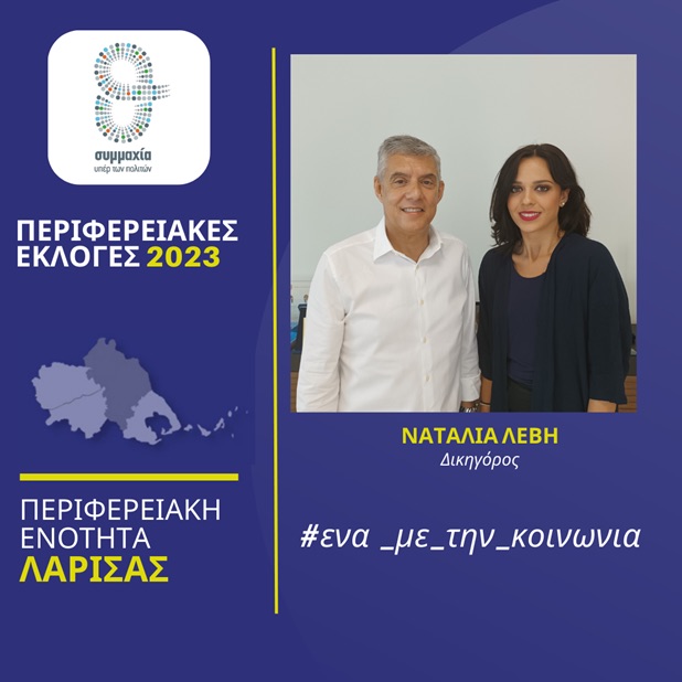Την δικηγόρο Ναταλία Λεβή, που κατέρχεται υποψήφια περιφερειακή σύμβουλος στην Π.Ε. Λάρισας στις αυτοδιοικητικές εκλογές του Οκτωβρίου, καλωσόρισε ο Περιφερειάρχης Θεσσαλίας Κώστας Αγοραστός στον συνδυασμό «Συμμαχία υπέρ των πολιτών» που έχει σταθερά στο επίκεντρο τον άνθρωπο, αγωνίζεται με έργα, δράσεις, πρωτοβουλίες για μια Περιφέρεια χωρίς διακρίσεις και αποκλεισμούς. Οι νέοι είναι το οξυγόνο της ζωής και φορείς νέων ιδεών.