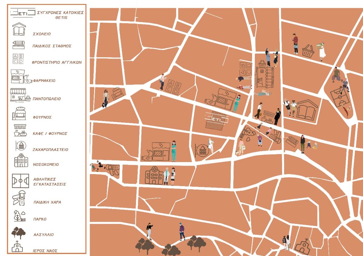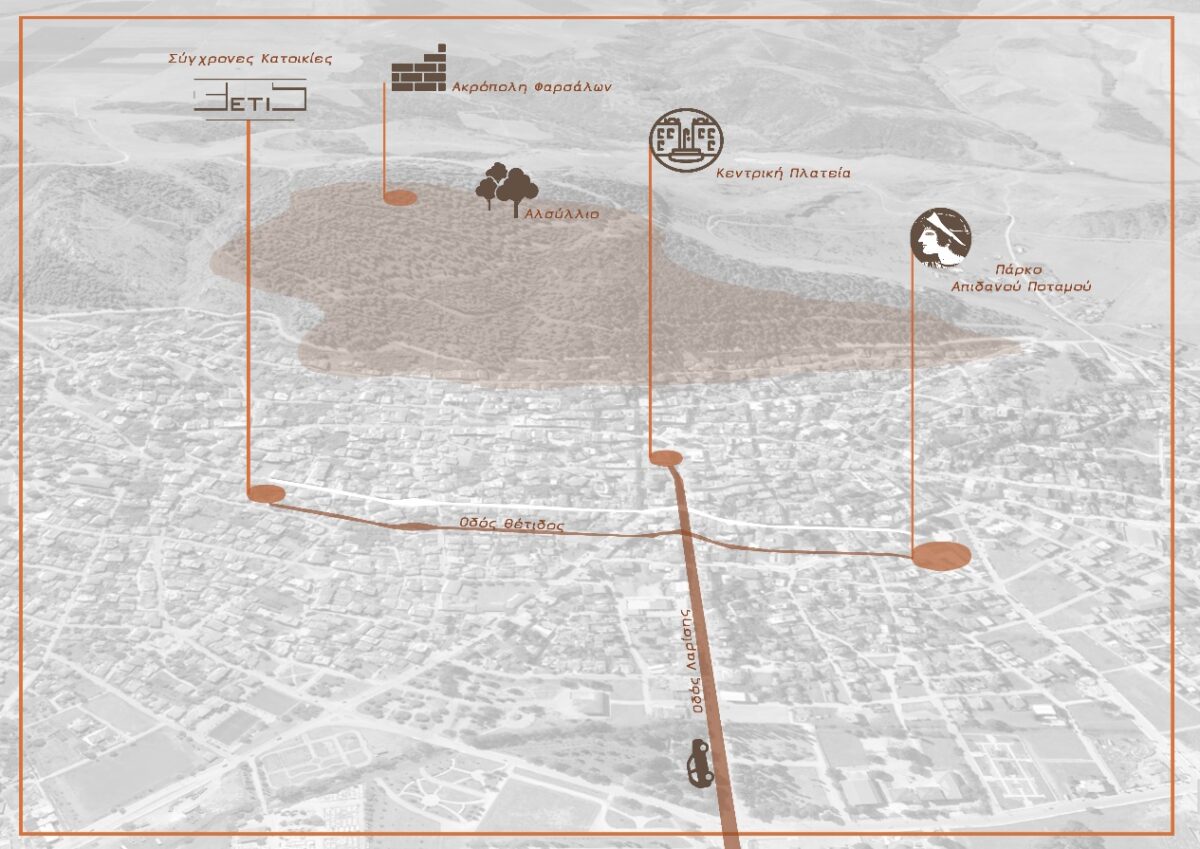 Η οδός Θέτιδος συνδέει τις συνοικίες με το κέντρο των Φαρσάλων και συγχρόνως διατηρεί μία ατμόσφαιρα γειτονιάς, με στοιχεία κοινωνικότητας για τους ενήλικες, βόλτας για τους νέους γονείς και παιχνιδιού για τα παιδιά.