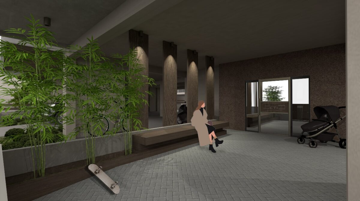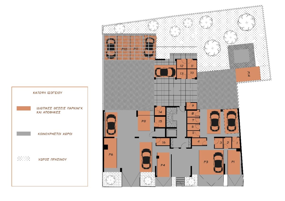 Στον χώρο της pilotis η ευρύχωρη είσοδος ενδείκνυται για παιχνίδι και προσωρινή στάση ενώ παράλληλα, οι θέσεις στάθμευσης και οι αποθήκες, ενσωματώνονται σε έναν ενιαίο χώρο πρασίνου.