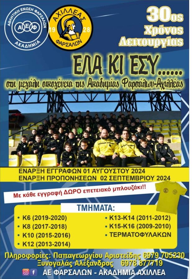 Ξεκίνησαν οι εγγραφές στην Ακαδημία Αχιλλέως Φαρσάλων που βαδίζει στον 30ο χρόνο της λειτουργίας της και φέτος θα λειτουργήσουν συνολικά 6 τμήματα και πιο συγκεκριμένα: Κ-16 (2009-10), Κ-14 (2011-12), Κ-12 (2013-14), Κ-10 (2015-16), Κ-8 (2017-18), Κ-6 (2019-20).