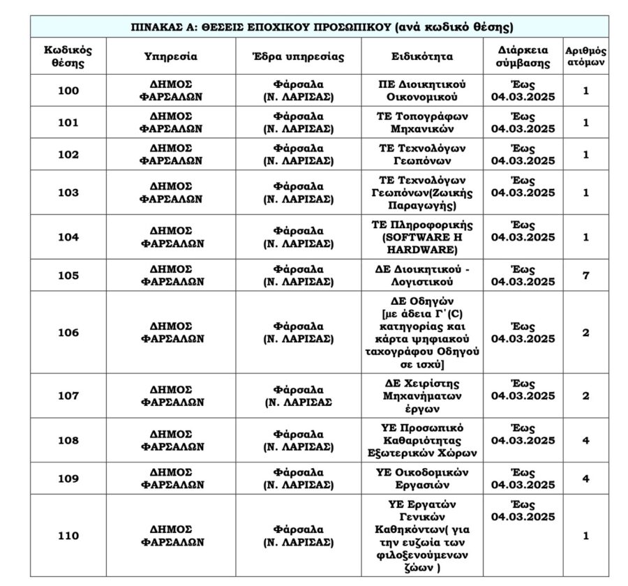 Ο Δήμος Φαρσάλων ανακοινώνει την πρόσληψη 25 ατόμων με σύμβαση εργασίας ιδιωτικού δικαίου ορισμένου χρόνου, διάρκειας έως τις 4 Μαρτίου 2025.