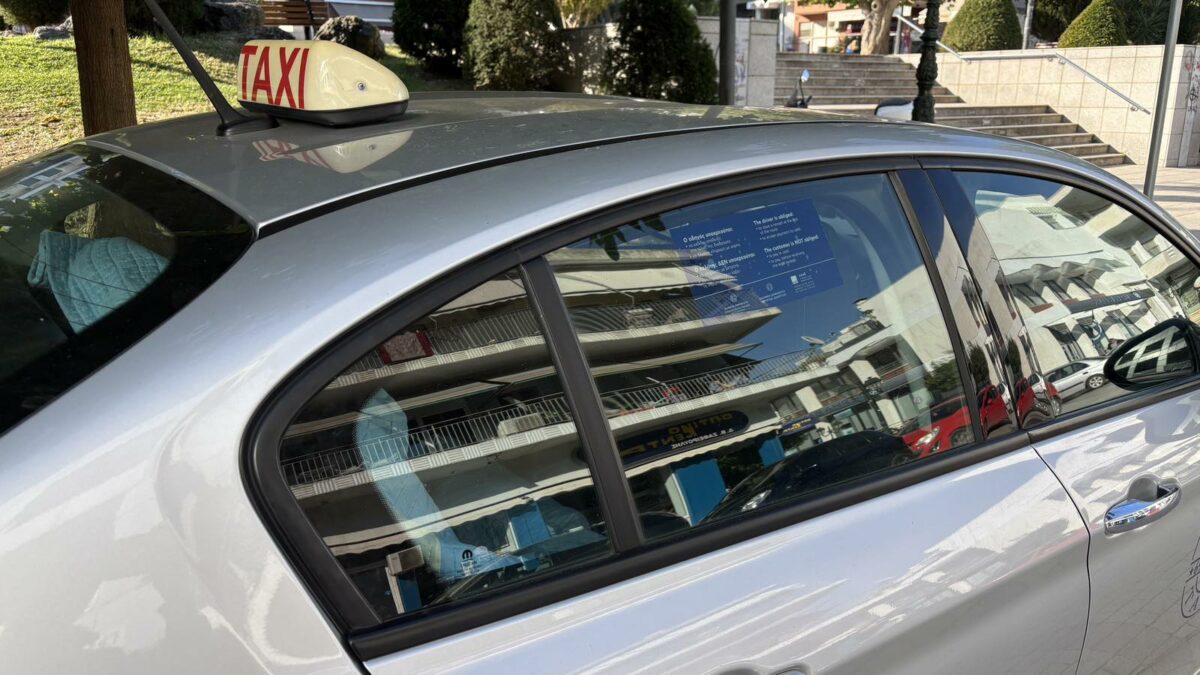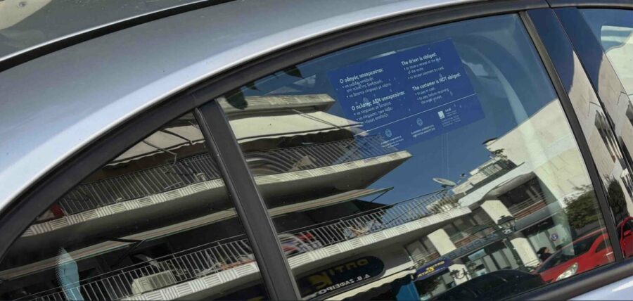 Άρχισαν να κολλούν στο πίσω τζάμι την ειδική σήμανση οι επαγγελματίες ΤΑΞΙ στα Φαρσάλων, ώστε να αποφύγουν το πρόστιμο.