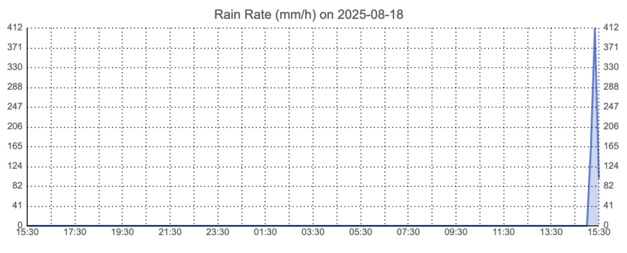 Ένα πρωτοφανές σε ένταση καιρικό φαινόμενο έπληξε σήμερα το μεσημέρι (18/08) την περιοχή της Σκοπιάς Φαρσάλων, με τον μετεωρολογικό σταθμό του Εθνικού Αστεροσκοπείου Αθηνών (ΕΑΑ) να καταγράφει υψηλή βροχόπτωση. Η βροχή, που εκδηλώθηκε με ραγδαίο ρυθμό, έφτασε τα 412 χιλιοστά ανά ώρα (ραγδαιότητα), προκαλώντας ταυτόχρονα κατακόρυφη πτώση της θερμοκρασίας. Ευτυχώς, είχε μικρή διάρκεια και έπεσαν λίγο πάνω από 30 χιλιοστά υετού.