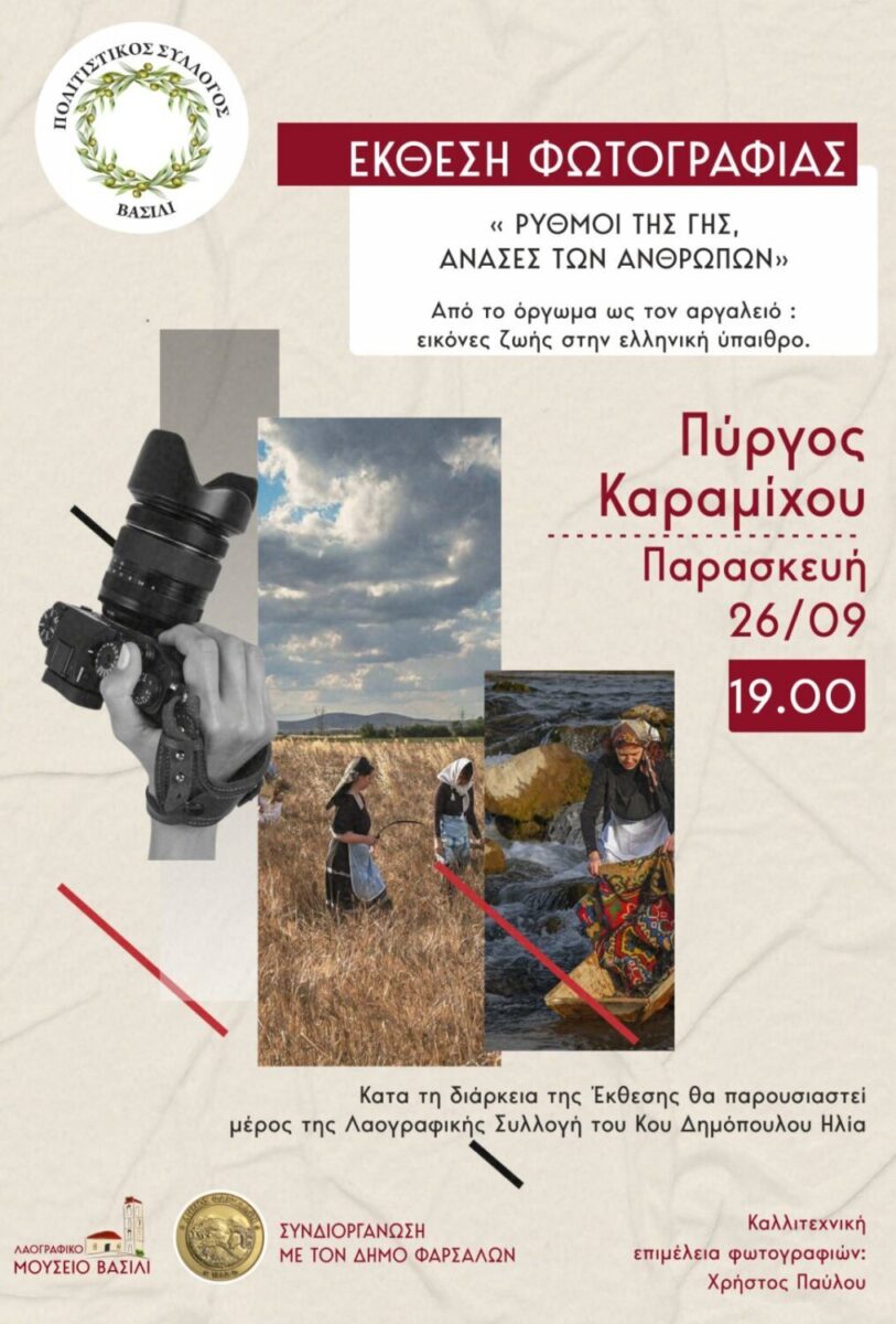 Ο Πολιτιστικός Σύλλογος Βασιλί σας προσκαλεί στα εγκαίνια της έκθεσης φωτογραφίας με τίτλο «Ρυθμοί της Γης, Ανάσες των Ανθρώπων. Από το όργωμα στον αργαλειό : Εικόνες ζωής από την ελληνική ύπαιθρο», την Παρασκευή 26/9 στις 7:00 μμ στον πύργο Καραμίχου.