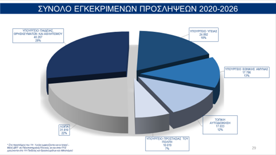 Σημειώνεται ότι ο προγραμματισμός των 19.489 προσλήψεων στο Δημόσιο για το 2026, αποτελεί συνέχεια των 122.203 προσλήψεων που έχουν εγκριθεί για τα έτη 2020 έως 2025 και άρα συνολικά 141.692 για το σύνολο της εξαετίας.