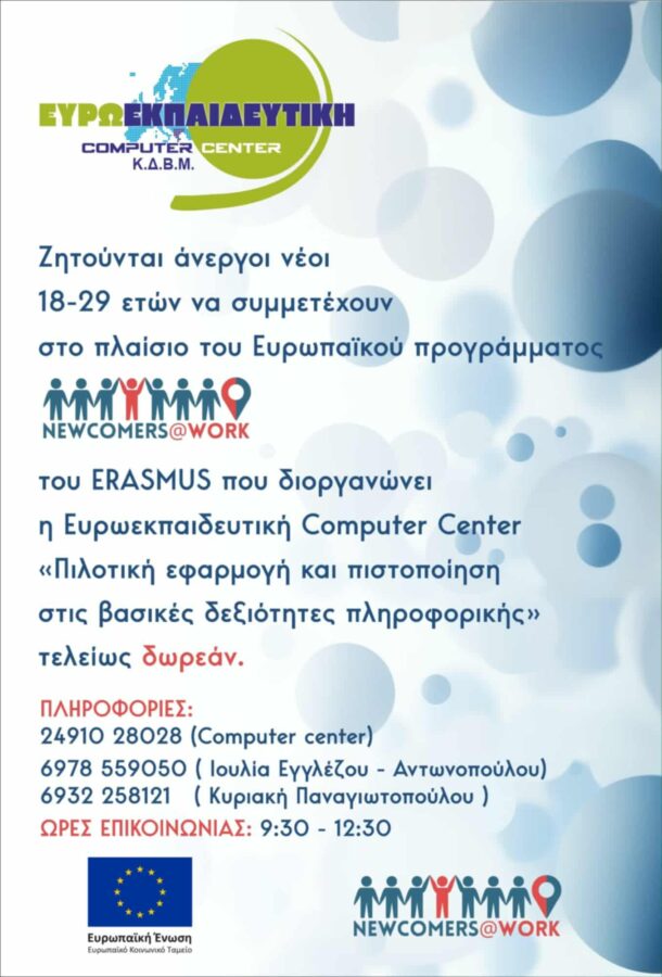 Ζητούνται άνεργοι νέοι 18-29 ετών να συμμετέχουν στο πλαίσιο του Ευρωπαϊκού προγράμματος NEWCOMERS@WORK του ERASMUS που διοργανώνει η Ευρωεκπαιδευτική Computer Center «Πιλοτική εφαρμογή και πιστοποίηση στις βασικές δεξιότητες πληροφορικής» τελείως δωρεάν.