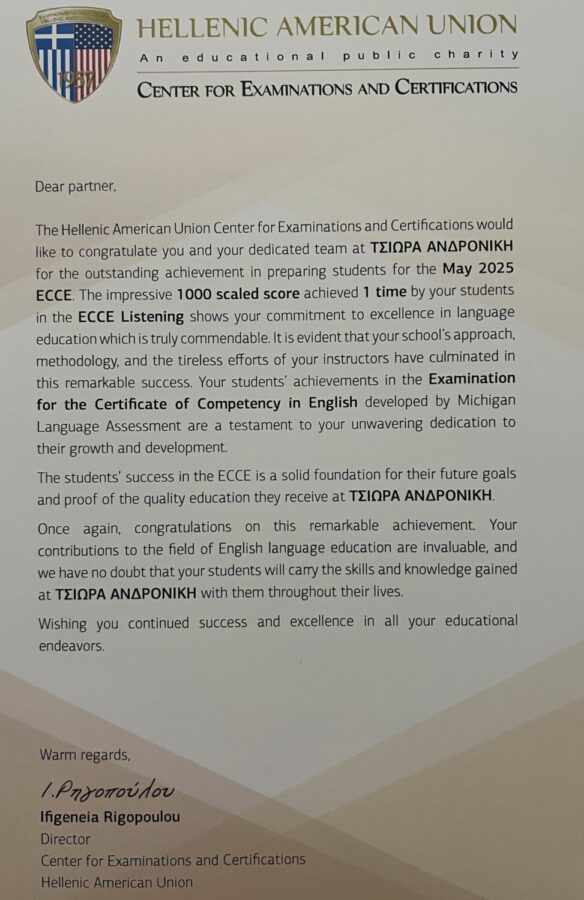 Η μεταφρασμένη επιστολή: Το Κέντρο Εξετάσεων και Πιστοποιήσεων της Ελληνοαμερικανικής Ένωσης θα ήθελε να συγχαρεί εσάς και την αφοσιωμένη ομάδα σας στο φροντιστήριο ΤΣΙΩΡΑ ΑΝΔΡΟΝΙΚΗ για τη σημαντική επιτυχία σας στην προετοιμασία μαθητών για τις εξετάσεις ECCE Μαΐου 2025.