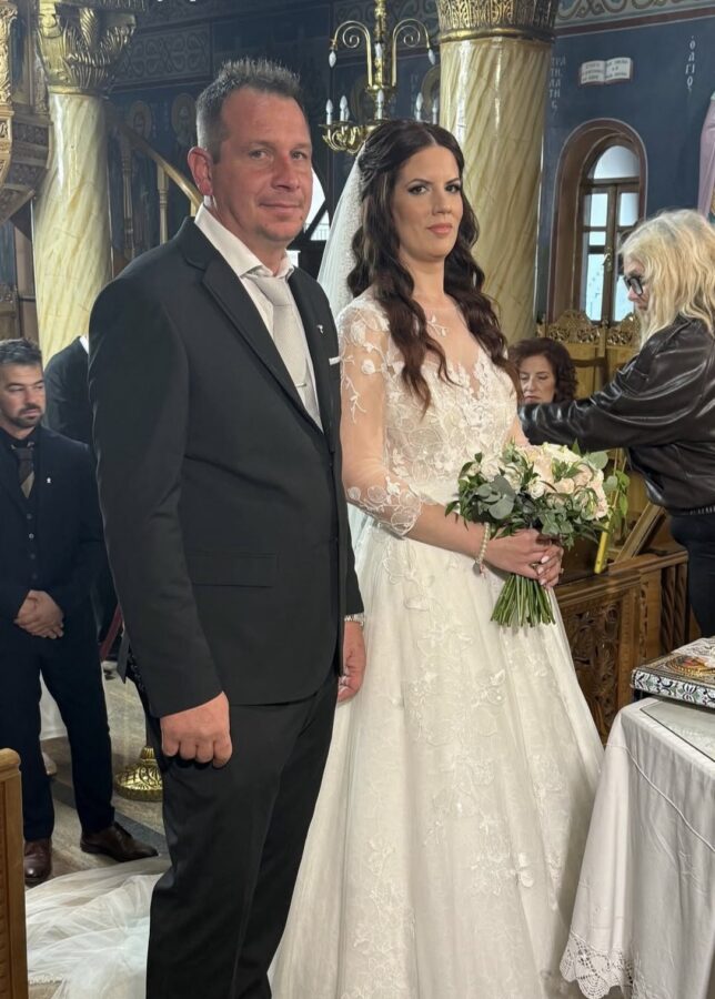Λίγο αργότερα, στον Ιερό Ναό έφτασε και η εκλεκτή της καρδιάς του, η νύφη Αγγελική Πάνου, με την οποία ενώθηκαν με τα δεσμά του γάμου, παρουσία φίλων και συγγενών του ζευγαρίου. Την ευτυχία του ζευγαριού επισφράγισαν οι κουμπάροι τους, ο Άγγελος Ζημιανίτης και η Χριστίνα Βασιλού.