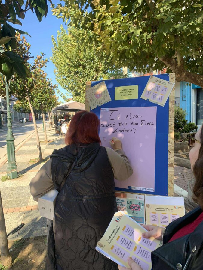 Κατά τη διάρκεια της δράσης, τα στελέχη του Κέντρου Κοινότητας διένειμαν ενημερωτικό υλικό και μοιράστηκαν με τους παρευρισκόμενους χρήσιμες συμβουλές για τη διατήρηση και ενίσχυση της ψυχικής ευεξίας. Με κεντρικό μήνυμα τη φράση «Τι είναι αυτό που σου δίνει δύναμη;», οι πολίτες κλήθηκαν να σκεφτούν και να μοιραστούν εκείνα τα απλά, καθημερινά πράγματα της ζωής που τους προσφέρουν χαρά, αισιοδοξία και εσωτερική ισορροπία.