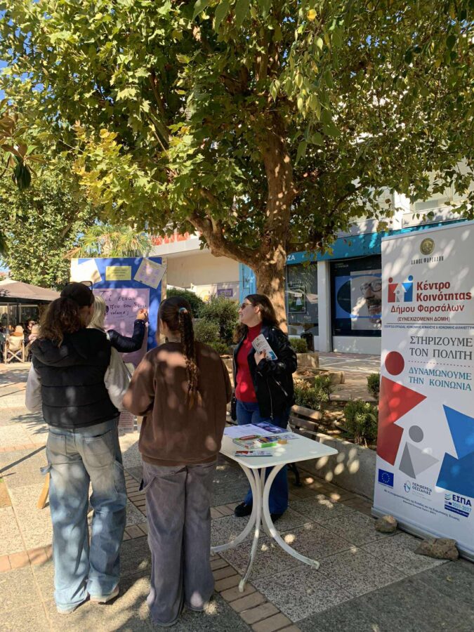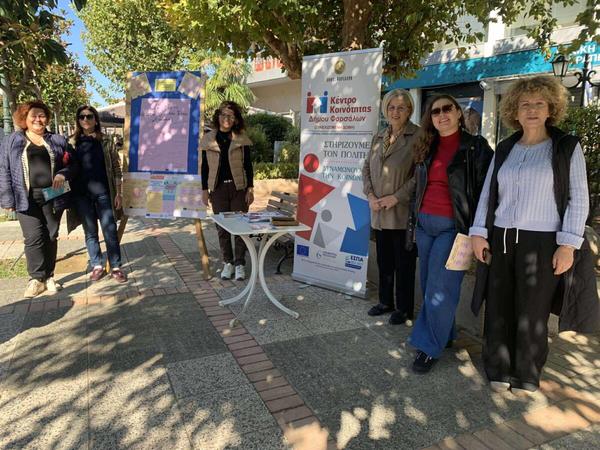 Το Κέντρο Κοινότητας του Δήμου Φαρσάλων, με αφορμή την Παγκόσμια Ημέρα Ψυχικής Υγείας, πραγματοποίησε την Παρασκευή (11/10) δράση ενημέρωσης στην Πλατεία Λαού του Δήμου μας, με στόχο την ευαισθητοποίηση και ενημέρωση των πολιτών σχετικά με θέματα ψυχικής υγείας.
