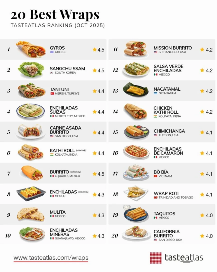 Σύμφωνα με τη νέα κατάταξη του TasteAtlas για τον Οκτώβριο του 2025, ο ελληνικός γύρος κατέκτησε την πρώτη θέση ανάμεσα στα είκοσι κορυφαία wraps του κόσμου, αφού συγκέντρωσε βαθμολογία 4.5 αστέρων. Ξεπέρασε διεθνώς γνωσμένα πιάτα όπως το burrito του Μεξικού, το tantuni της Τουρκίας και τις enchiladas, και βρέθηκε στην κορυφή μιας ιδιαίτερα ανταγωνιστικής λίστας. Την πεντάδα συμπληρώνουν το Sangchu Ssam από τη Νότια Κορέα, το Tantuni από την Τουρκία, οι Enchiladas Suizas από το Μεξικό και το Carne Asada Burrito από τις Ηνωμένες Πολιτείες.