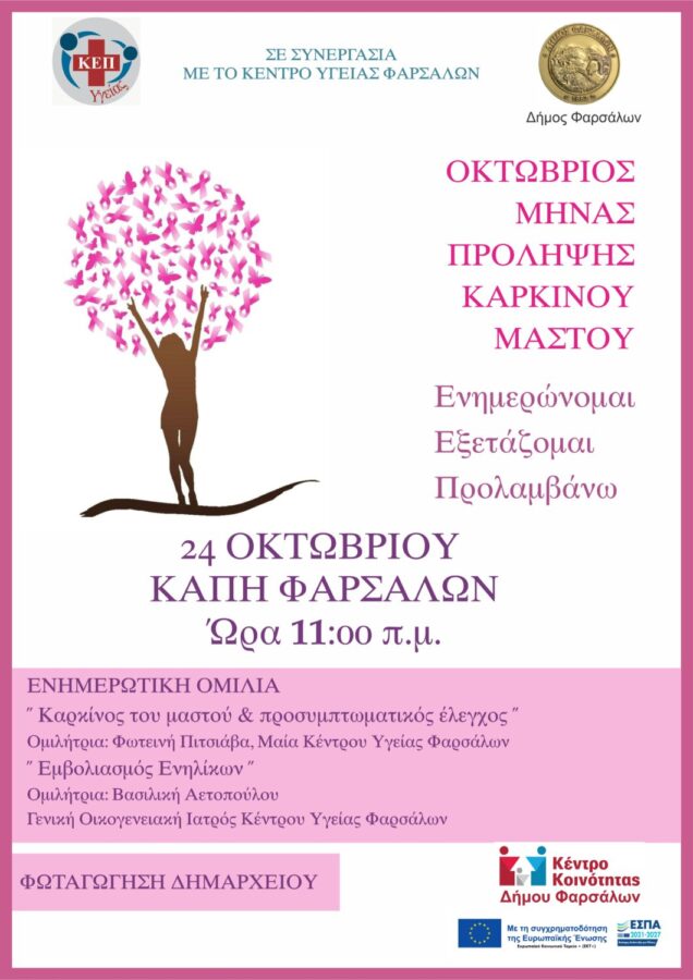 Στο πλαίσιο της διαρκούς προσπάθειας για προαγωγή της υγείας και της πρόληψης, το ΚΕΠ Υγείας και το Κέντρο Κοινότητας του Δήμου Φαρσάλων σε συνεργασία με το Κέντρο Υγείας Φαρσάλων, με αφορμή την Παγκόσμια Ημέρα κατά του καρκίνου του μαστού, διοργανώνει ενημερωτική ομιλία με θέμα: «Καρκίνος του Μαστού – Προσυμπτωματικός Έλεγχος» και «Εμβολιασμός Ενηλίκων». Η εκδήλωση θα γίνει την Παρασκευή 24 Οκτωβρίου στις 11 το πρωί, στον χώρο του ΚΑΠΗ Φαρσάλων.