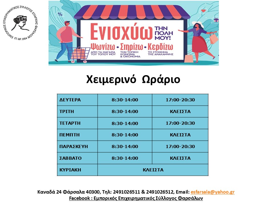 Το Διοικητικό Συμβούλιο του Εμπορικού Επιχειρηματικού Συλλόγου Επαρχίας Φαρσάλων κάνει γνωστό στους συναδέλφους και στο καταναλωτικό κοινό ότι με την εφαρμογή της χειμερινής ώρας, το ωράριο των καταστημάτων από την Δευτέρα 27 Οκτωβρίου 2025 διαμορφώνεται ως εξής:
