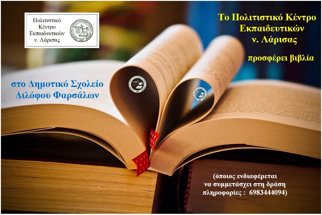 Το Πολιτιστικό Κέντρο Εκπαιδευτικών νομού Λάρισας – ΠΟΚΕΛ θα προσφέρει βιβλία στο Δημοτικό Σχολείο Διλόφου Φαρσάλων, μετά από πρόσκληση της διευθύντριας, ώστε να ενισχυθεί η σχολική βιβλιοθήκη με νέους τίτλους βιβλίων και για αυτή τη σχολική χρονιά.