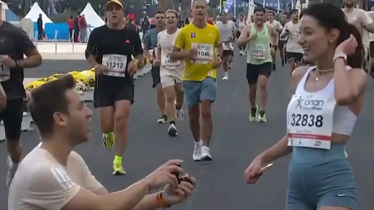 Ο ερωτευμένος νεαρός αποφάσισε να κάνει την πρόταση γάμου γονατίζοντας στην γραμμή τερματισμού των 10 χλμ του 42ου Αυθεντικού Μαραθώνιο Αθήνας, με την Τουρκάλα μαραθωνοδρόμο, την Νουρ Εϊγκούν -που μόλις είχε τελειώσει μετά από 48 λεπτά αγώνα- αρχικά να μένει έκπληκτη.