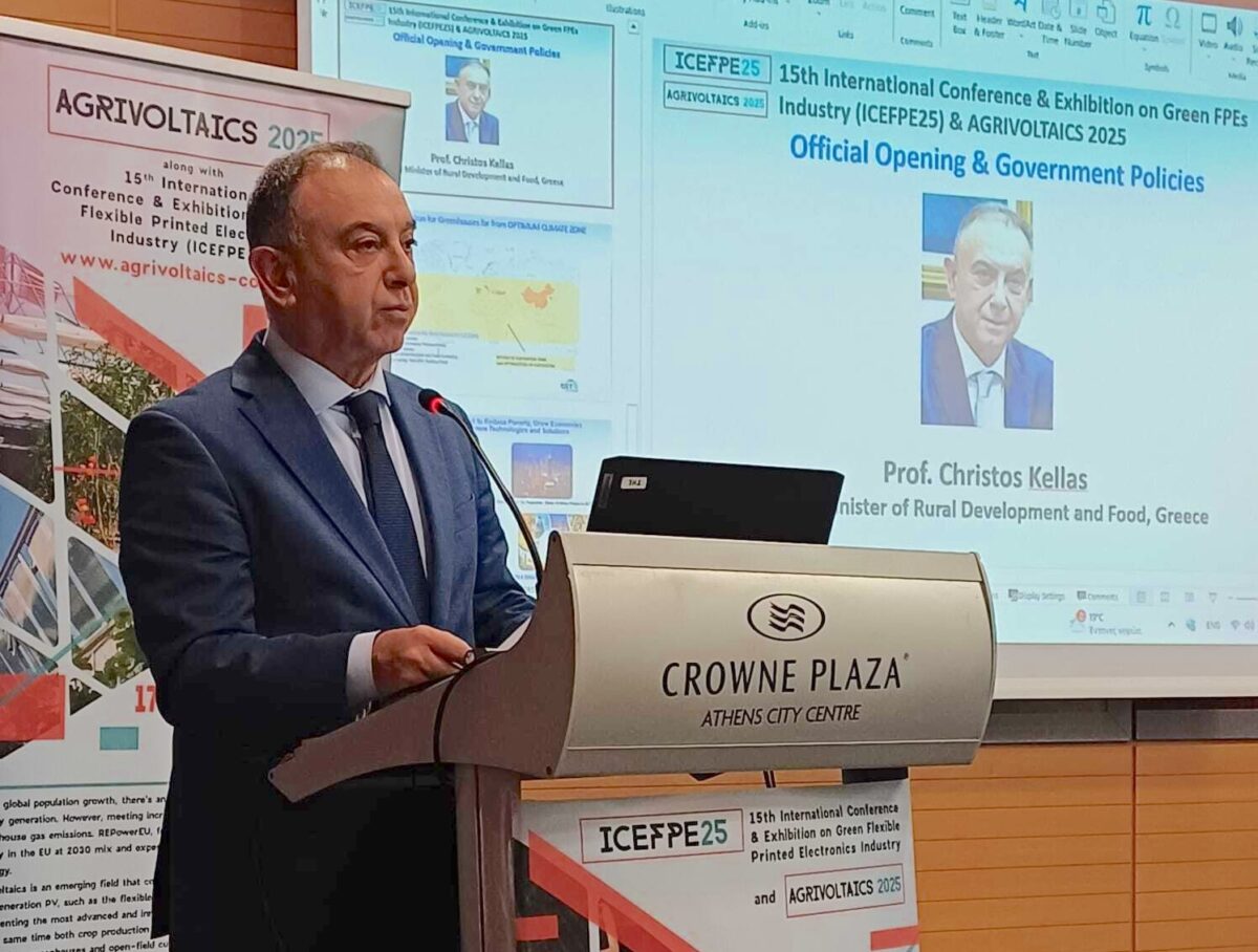 Με ιδιαίτερη έμφαση στον κομβικό ρόλο της τεχνολογικής καινοτομίας στη σύγχρονη αγροτική παραγωγή, ο Υφυπουργός Αγροτικής Ανάπτυξης και Τροφίμων, κ. Χρήστος Κέλλας, απηύθυνε χαιρετισμό σήμερα στο Διεθνές Συνέδριο AGRIVOLTAICS 2025, το οποίο φιλοξενεί κορυφαίους επιστήμονες, ερευνητικά ιδρύματα, επιχειρήσεις υψηλής τεχνολογίας και θεσμικούς φορείς από την Ελλάδα και το εξωτερικό.