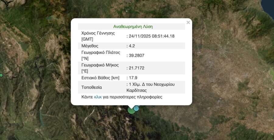 Σεισμική δόνηση μεγέθους 4,2 βαθμών της κλίμακας Ρίχτερ καταγράφηκε το πρωί της Δευτέρας, 24 Νοεμβρίου 2025, στην περιοχή της Καρδίτσας.