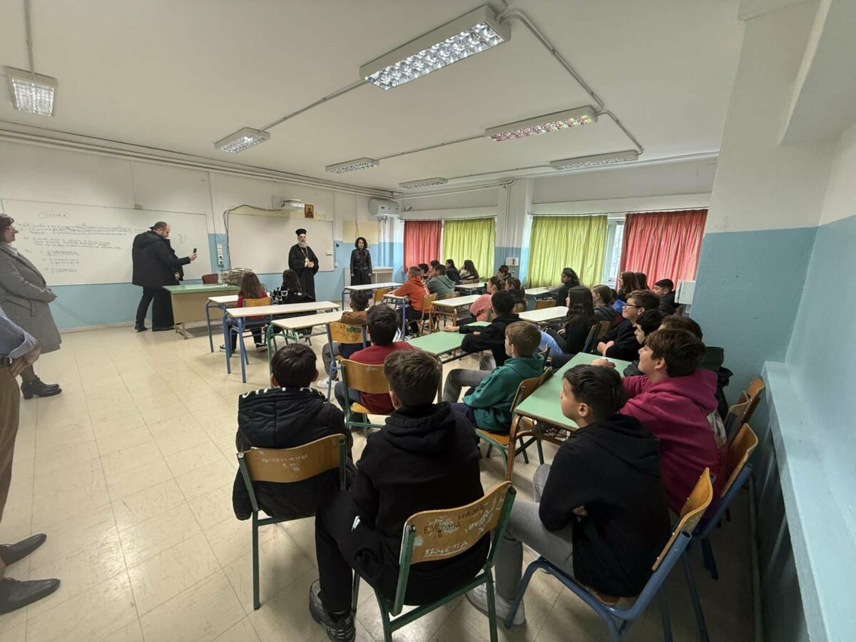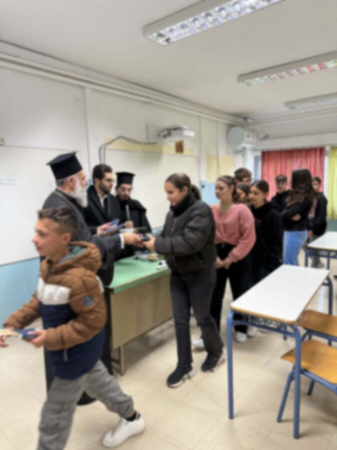Με αφορμή την επίσκεψη στην Α΄ Τάξη Γυμνασίου, ο Σεβασμιώτατος προσέφερε στα παιδιά το βιβλίο της Καινής Διαθήκης για να τη μελετούν, να γαληνεύουν και να στηρίζονται πνευματικά, ερχόμενοι κοντά στον Θεό.