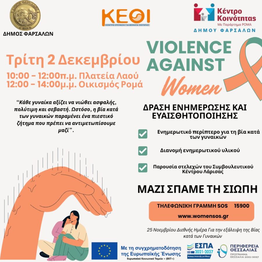 Το Κέντρο Κοινότητας του Δήμου Φαρσάλων σε συνεργασία με το Συμβουλευτικό Κέντρο Λάρισας, με αφορμή την Παγκόσμια ημέρα εξάλειψης της Βίας κατά των γυναικών σας ενημερώνουν πως την Τρίτη 2 Δεκεμβρίου 2025 θα πραγματοποιηθεί δράση ενημέρωσης και ευαισθητοποίησης «ενημερωτικό περίπτερο για τη βία κατά των γυναικών» με διανομή ενημερωτικού υλικού, παρουσία των στελεχών του Συμβουλευτικού Κέντρου Λάρισας.