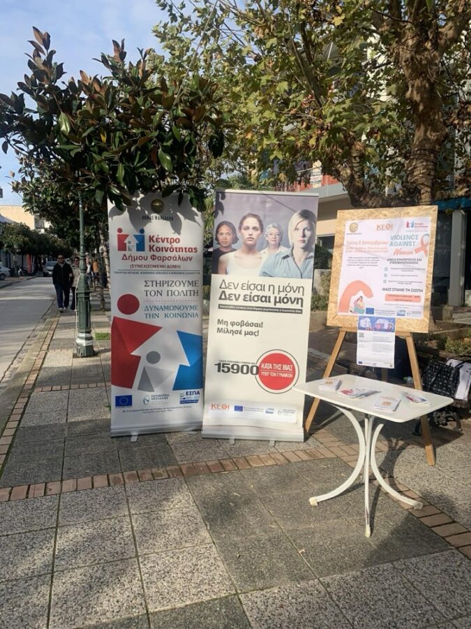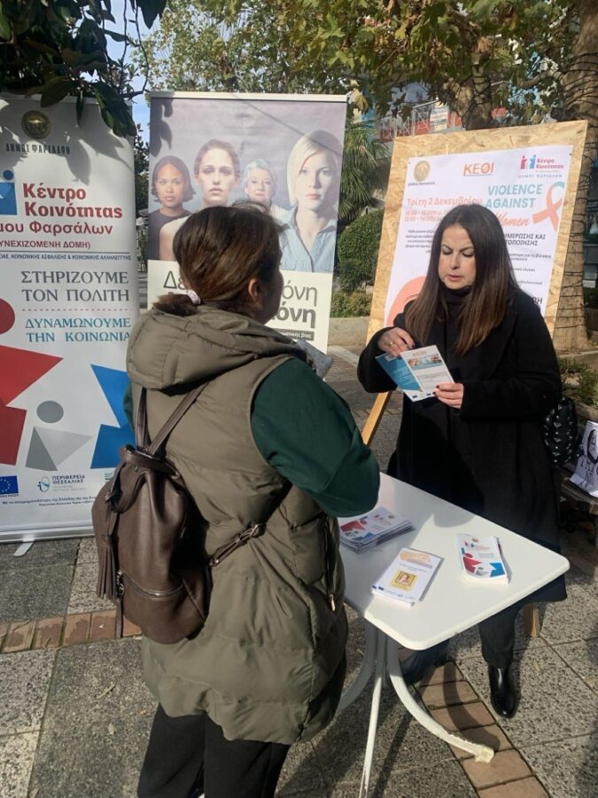 Την Τρίτη 2 Δεκεμβρίου 2025, στο πλαίσιο της Παγκόσμιας Ημέρας για την Εξάλειψη της Βίας κατά των Γυναικών, 25 Νοεμβρίου, το Κέντρο Κοινότητας Δήμου Φαρσάλων Με Παράρτημα ΡΟΜΑ σε συνεργασία με το Συμβουλευτικό Κέντρο του ΚΕΘΙ (Κέντρο Ερευνών για Θέματα Ισότητας), πραγματοποίησε σε 2 σημεία της πόλης μας, στην πλατεία Λαού του Δήμου Φαρσάλων και στον Οικισμό ΡΟΜΑ, ενημερωτικό περίπτερο, με στόχο την ενημέρωση και την ευαισθητοποίηση του κοινού σε θέματα αντιμετώπισης περιστατικών βίας και κακοποίησης των γυναικών.