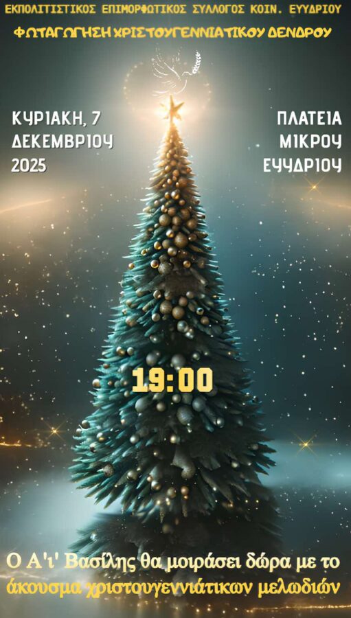 Ο επιμορφωτικός εκπολιτιστικός σύλλογος Ευυδρίου σας προσκαλεί στην φωταγώγηση του χριστουγεννιάτικου δέντρου στην πλατεία του Μικρού Ευυδρίου την Κυριακή 7 Δεκεμβρίου και ώρα 19:00.
