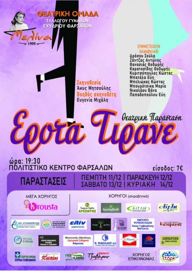 Η Θεατρική Ομάδα του Συλλόγου Γυναικών Μελίνα παρουσιάζει μια κωμωδία όπου τίποτα δεν πάει όπως το περιμένεις… και γι’ αυτό γελάς ακόμα περισσότερο. Με τέσσερις μοναδικές παραστάσεις στις 11, 12, 13 & 14 Δεκεμβρίου στις 7:30 το απόγευμα στο Πολιστικό Κέντρο Φαρσάλων.