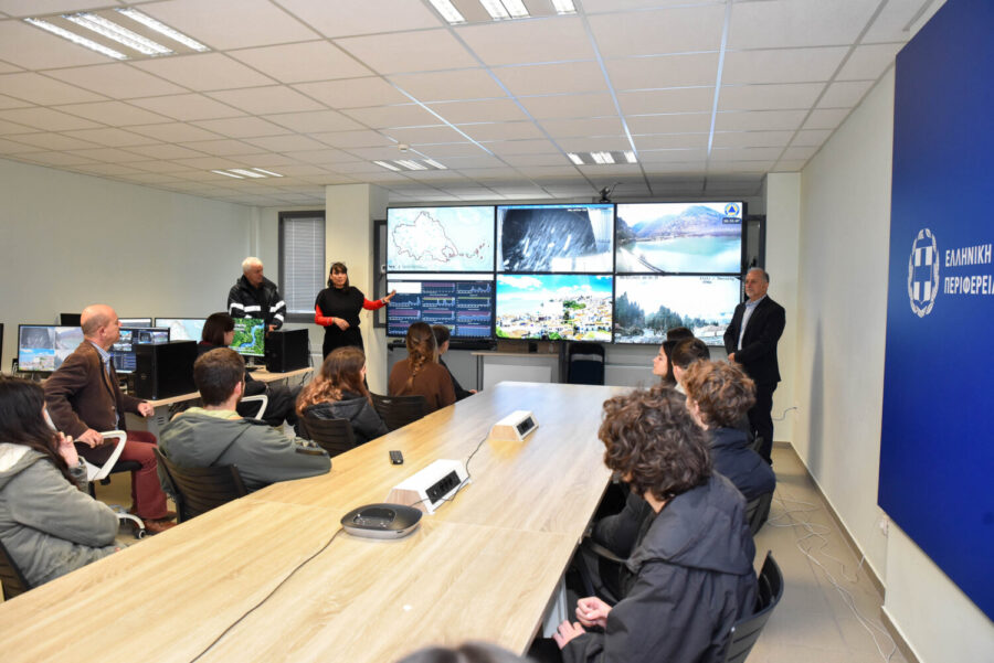 Το πρόγραμμα χαιρέτησε ο Περιφερειάρχης Θεσσαλίας κ. Δημ. Κουρέτας, ο οποίος καλωσόρισε τους μαθητές που επισκέφθηκαν το Κέντρο, τους ευχαρίστησε για τη συμμετοχή τους και τους εξήγησε αρχικά ότι το νέο Κέντρο Πολιτικής Προστασίας έχει φτιαχτεί με στόχο την προστασία των πολιτών, όπως δηλώνει και ο ξένος όρος «civil protection». Τόνισε ότι το Κέντρο διαθέτει τεχνολογία που επιτρέπει την προληπτική διαχείριση φυσικών καταστροφών, από την παρακολούθηση της βροχόπτωσης και της στάθμης των ποταμών μέχρι τη μεταφορά κρίσιμων πληροφοριών στις υπηρεσίες. Υπογράμμισε, μάλιστα, ότι η πολιτική προστασία συμβάλλει στη διαχείριση γεγονότων όπως πυρκαγιές ή σεισμοί, ενώ παρέχει υποστήριξη και διευκόλυνση πρόσβασης σε ρεύμα ή ίντερνετ σε πληγείσες περιοχές.