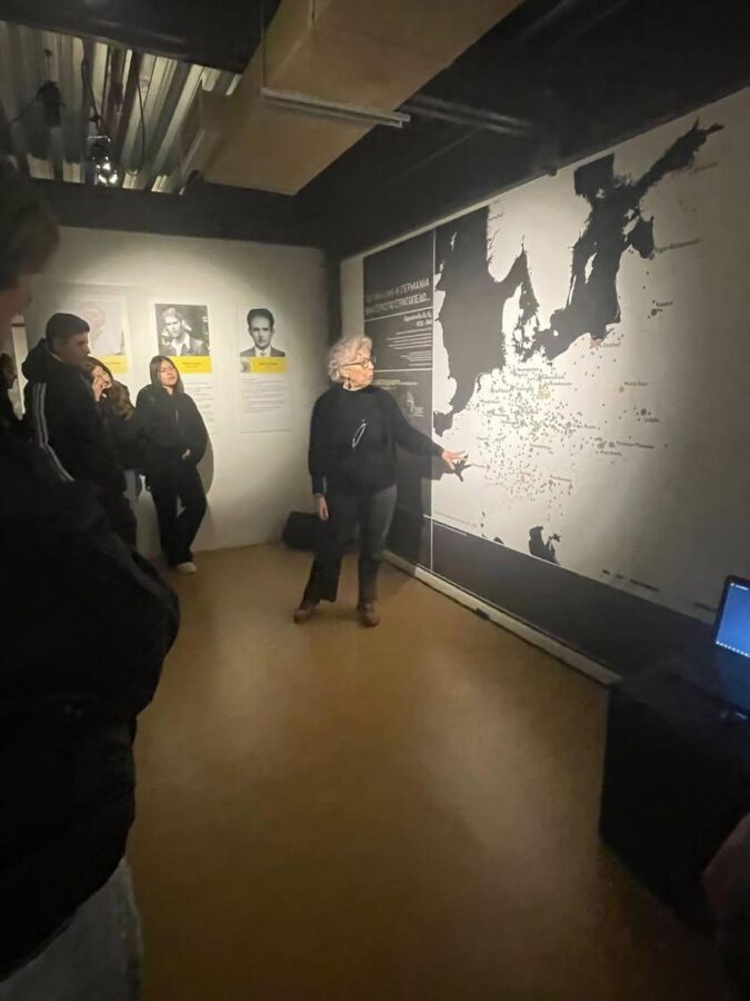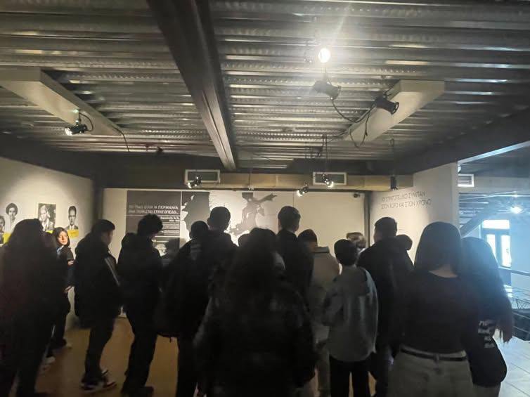 Η Μένη Τσίγκρα, ενεργό μέλος της ΟΠΙΒΟ, μας ξενάγησε στους χώρους του μουσείου που ήταν διαμορφωμένοι για το πρόγραμμα. Η περιήγηση ξεκίνησε από ένα συγκλονιστικό ηχητικό τοπίο: αλιχτίσματα σκυλιών, σειρήνες και βόμβοι που δημιουργούσαν την αίσθηση μιας διαρκούς απειλής. Αυτή η ενσώματη εμπειρία μας μετέφερε αμέσως στους φρικτούς χρόνους του Β’ Παγκοσμίου Πολέμου και στα στρατόπεδα συγκέντρωσης.