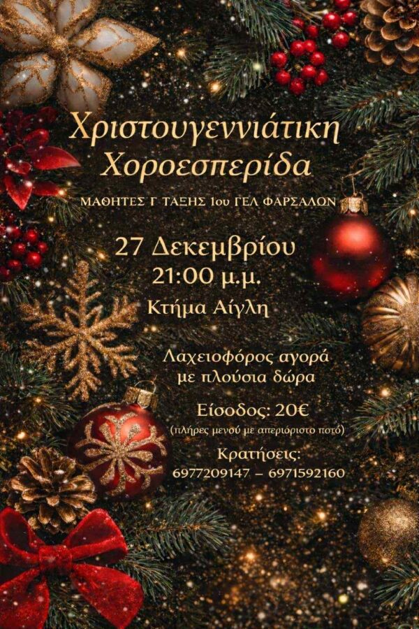 Στο πνεύμα των εορτών, οι μαθητές της τρίτης τάξης του 1ου Γενικού Λυκείου Φαρσάλων διοργανώνουν την καθιερωμένη χριστουγεννιάτικη χοροεσπερίδα τους. Η εκδήλωση θα πραγματοποιηθεί απόψε, Σάββατο 27 Δεκεμβρίου, με ώρα προσέλευσης τις 21:00, στον χώρο του κτήματος «Αίγλη».