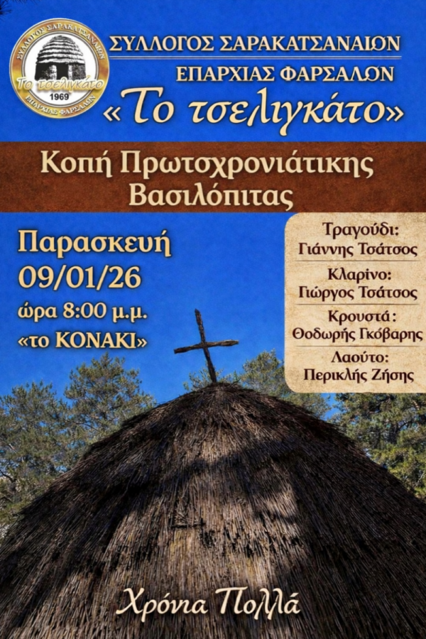 Την καθιερωμένη εκδήλωση για την κοπή της πρωτοχρονιάτικης βασιλόπιτας πραγματοποιεί ο Σύλλογος Σαρακατσαναίων Επαρχίας Φαρσάλων «Το Τσελιγκάτο». Η εκδήλωση θα λάβει χώρα την Παρασκευή 9 Ιανουαρίου 2026 και ώρα 20:00, στην ταβέρνα «Το Κονάκι» στα Φάρσαλα.