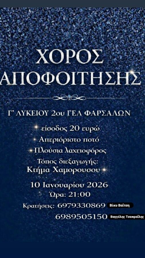 Οι μαθητές της Γ’ Λυκείου του 2ου ΓΕΛ Φαρσάλων σας προσκαλούν στον ετήσιο χορό αποφοίτησής τους, που θα πραγματοποιηθεί το Σάββατο 10 Ιανουαρίου 2026.