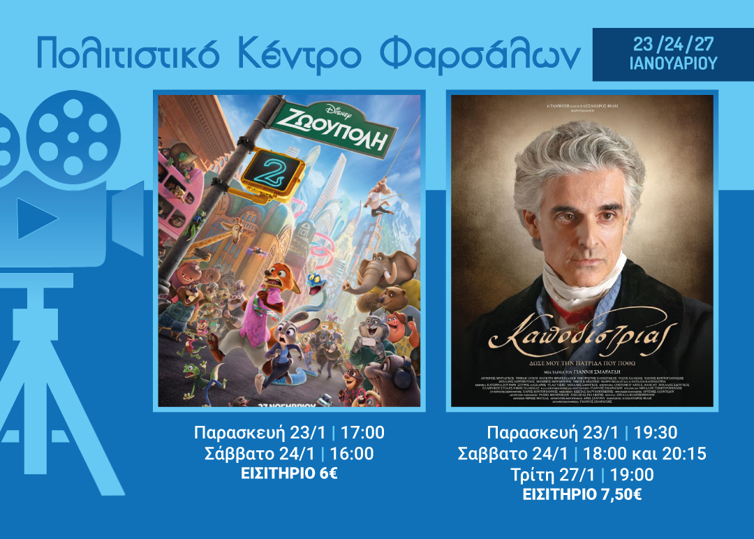 Το Πολιτιστικό Κέντρο Φαρσάλων υποδέχεται ένα ξεχωριστό κινηματογραφικό πρόγραμμα για μικρούς και μεγάλους, με προβολές των ταινιών «Ζωούπολη» και «Καποδίστριας», στις 23, 24 και 27 Ιανουαρίου.