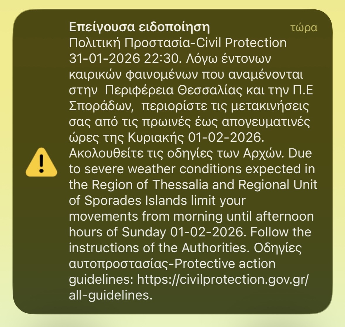 Επείγουσα προειδοποίηση έστειλε η Πολιτική Προστασία αργά το βράδυ του Σαββάτου (31/01) στους κατοίκους της Θεσσαλίας και των Σποράδων, θέτοντας τις αρχές και τους πολίτες σε κατάσταση αυξημένης ετοιμότητας ενόψει της αναμενόμενης επιδείνωσης του καιρού.