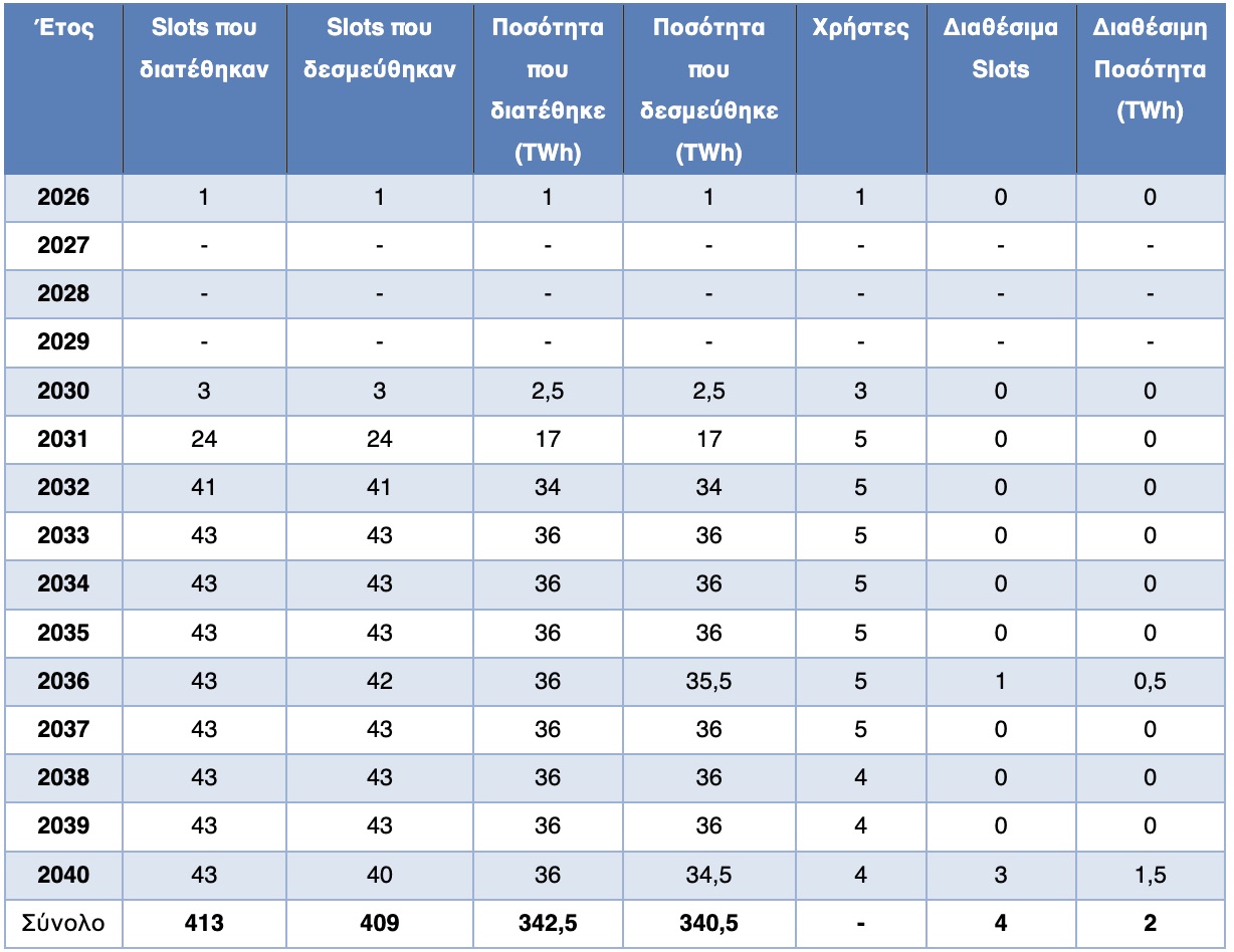 Στο πλαίσιο της διαδικασίας προσφέρθηκαν 413 χρονοθυρίδες εκφόρτωσης, που αντιστοιχούν σε συνολική ποσότητα LNG ύψους 342,5 TWh, εκ των οποίων δεσμεύτηκαν 409, συνολικής ποσότητας 340,5 TWh, με συμμετοχή έως και πέντε χρηστών ανά έτος, γεγονός που καταδεικνύει για ακόμη μία φορά το έντονο ενδιαφέρον της αγοράς.