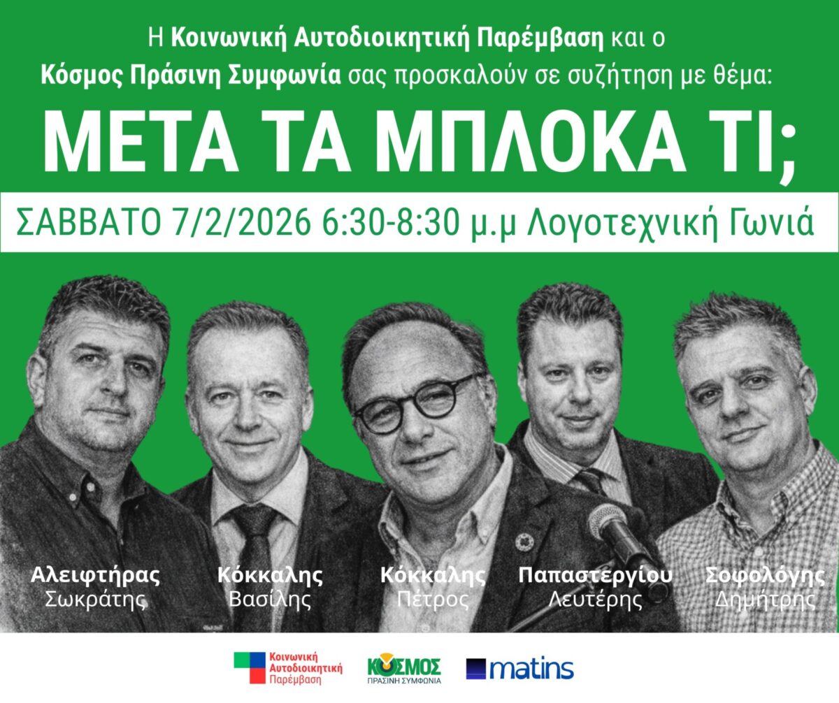 Το Σάββατο 7 Φεβρουαρίου 2026, στις 6:30 – 8:30 μ.μ., στη «Λογοτεχνική Γωνία» (Γαληνού 3 και Φαρμακίδου, στη Λάρισα) η «Κοινωνική Αυτοδιοικητική Παρέμβαση» και ο «Κόσμος-Πράσινη Συμφωνία» συνδιοργανώνουν εκδήλωση-συζήτηση για το αγροτικό ζήτημα μετά τα μπλόκα.