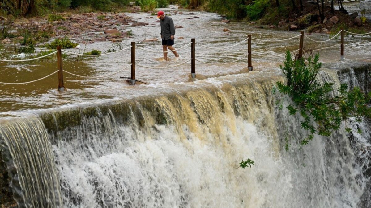 Εναέρια πλάνα το Σάββατο έδειξαν περιοχές βυθισμένες στα νερά των πλημμυρών και υψηλή στάθμη σε φράγμα της περιοχής.