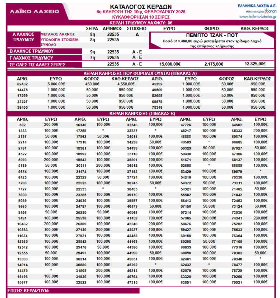 Χωρίς νικητή στον «Τρίδυμο Λαχνό» ολοκληρώθηκε η 6η κλήρωση του Λαϊκού Λαχείου, που πραγματοποιήθηκε την Τρίτη 10 Φεβρουαρίου 2026, οδηγώντας σε νέο, πέμπτο κατά σειρά, Τζακ-Ποτ.