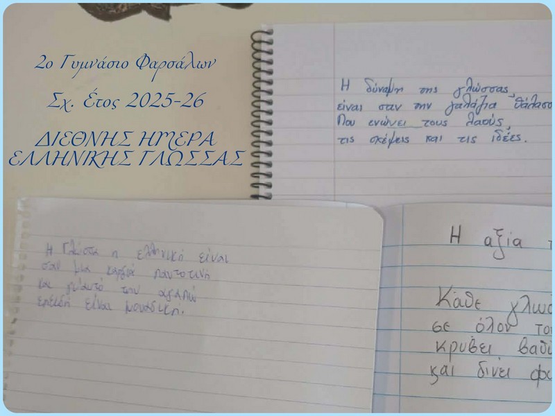 Με αφορμή την ημέρα αυτή, στο 2ο Γυμνάσιο Φαρσάλων πραγματοποιήθηκαν δημιουργικές δράσεις στα τμήματα Α3 και Α4 και τη Γ Τάξη. Οι δράσεις υλοποιήθηκαν από τη φιλόλογο κ. Μουχτή Ζωή, σε συνεργασία με τη Διευθύντρια του σχολείου κ. Βίκυ Τασιοπούλου, και περιελάμβαναν ένα 45λεπτο βιωματικό εργαστήριο, το οποίο συνδύασε τη γλωσσική ιστορία, το παιχνίδι και τη δημιουργική έκφραση.
