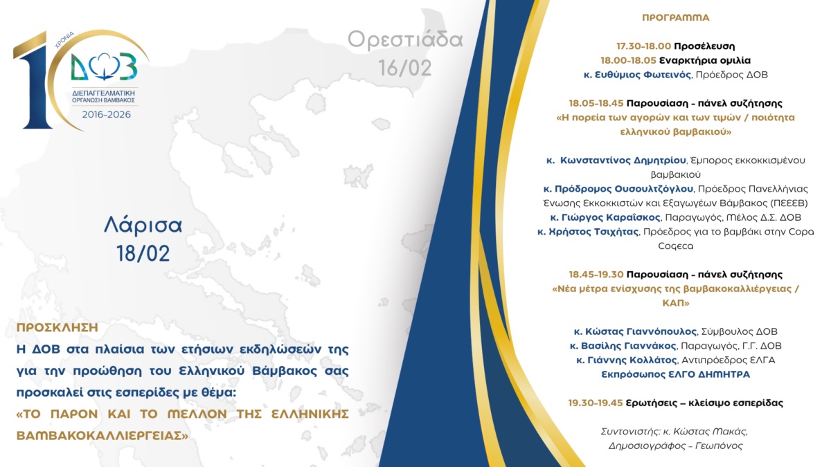 Την Τετάρτη 18 Φεβρουαρίου θα πραγματοποιηθεί η 2η εσπερίδα της Διεπαγγελματικής Οργάνωσης Βάμβακος για το 2026, στη Λάρισα (Ξενοδοχείο Grecotel Larissa Imperial) με τίτλο: «Το παρόν και το μέλλον της ελληνικής βαμβακοκαλλιέργειας» στα πλαίσια των ετήσιων εκδηλώσεων της Διεπαγγελματικής για την προώθηση του Ελληνικού Βαμβακιού.