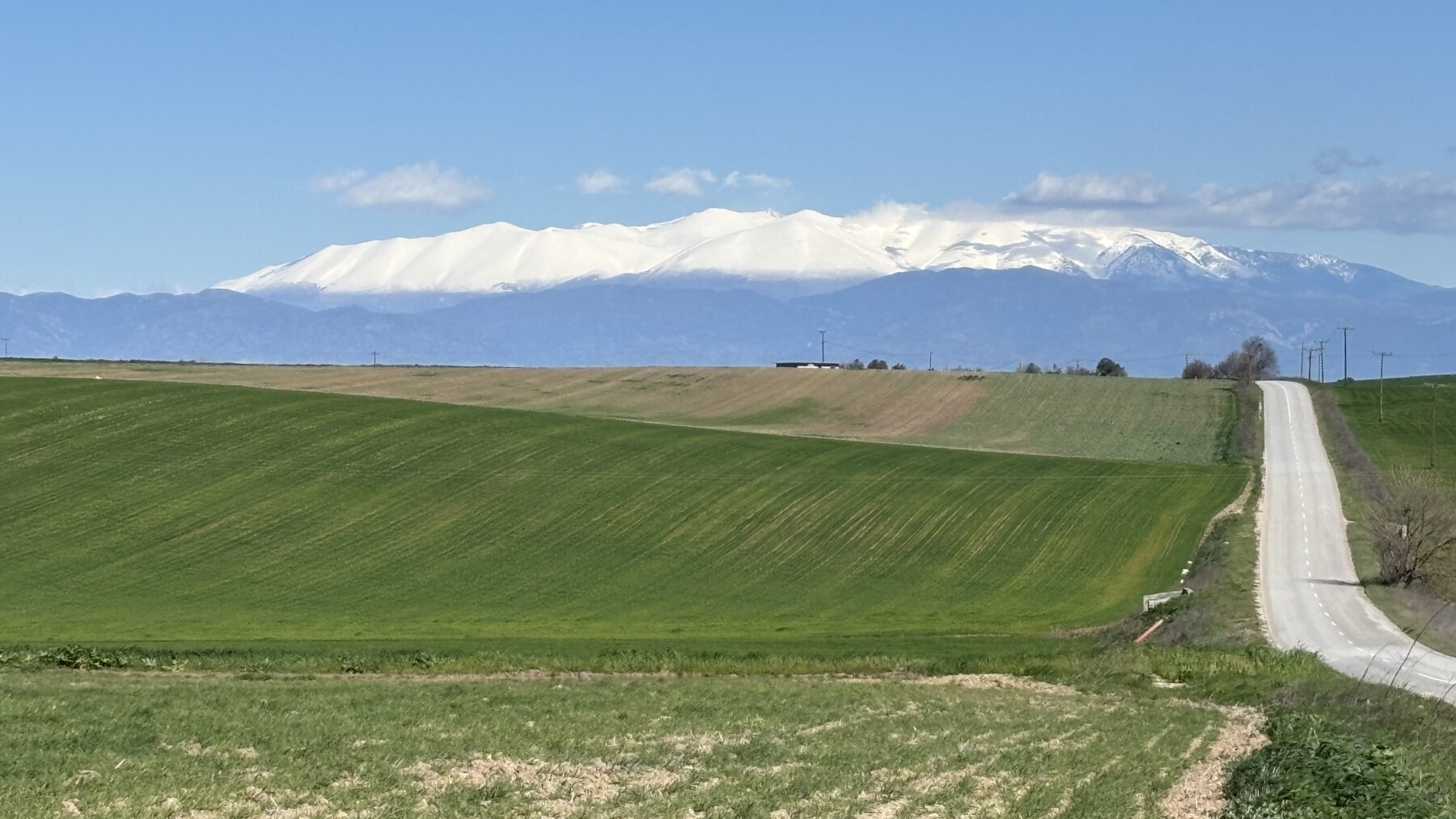 Πράσινα χαλιά και ο χιονισμένος Όλυμπος να δεσπόζει στο βάθος, κάτω από το γαλάζιο του Φλεβάρη
