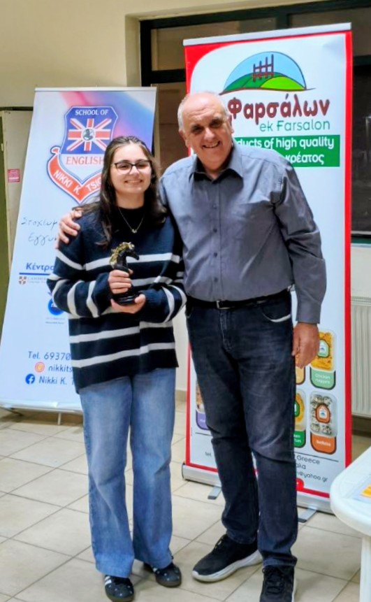 - Η μικρούλα Μιχαέλα Μπουλαμάτση τιμήθηκε με μετάλλιο ήθους για την εξαιρετική συμπεριφορά της στους αγώνες. Σε εντελώς χαμένη θέση, και ενώ της προσφέρθηκε ισοπαλία από τον αντίπαλο της, δε δέχθηκε την πρόταση και προτίμησε να χάσει την παρτίδα. Αυτή η πολύ ώριμη κίνηση πρέπει να είναι οδηγός για όλους τους εκκολαπτόμενους σκακιστές μας, δείχνοντας μια βαθιά κατανόηση ότι και η ήττα είναι μέρος του παιχνιδιού και ότι στο μέλλον θα αξιοποιήσουν αυτή την εμπειρία για να βελτιωθούν και να ανεβούν με την αξία τους.