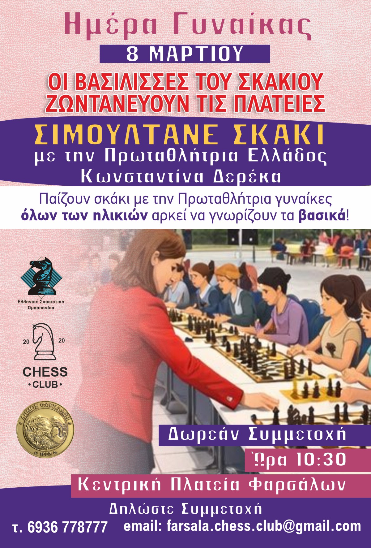 Την Κυριακή 8 Μαρτίου, ημέρα της Γυναίκας, διοργανώνονται σε όλη τη χώρα σκακιστικές δράσεις με τίτλο «Οι Βασίλισσες του Σκακιού ζωντανεύουν τις πλατείες». Οι ανοικτές αυτές εκδηλώσεις είναι αφιερωμένες στην ενίσχυση της γυναικείας παρουσίας στο σκάκι και στη δυναμική προβολή του αθλήματος στον δημόσιο χώρο. Έχει ήδη ανακοινωθεί η διοργάνωση σκακιστικού σιμουλτανέ (ταυτόχρονος αγώνας μιας ισχυρής σκακίστριας εναντίον πολλών αντιπάλων), με τη συμμετοχή μόνο γυναικών, όλων των ηλικιών και ανεξάρτητα από το επίπεδο του παιχνιδιού τους, με την φαρσαλινή Κωνσταντίνα Δερέκα, αθλήτρια του Γαλαξία Θεσσαλονίκης. Η εκδήλωση διοργανώνεται μαζί με το Δήμο Φαρσάλων και την Ελληνική Σκακιστική Ομοσπονδία. Μέχρι στιγμής, στη Θεσσαλία έχει ανακοινωθεί άλλη μία ανάλογη εκδήλωση στα Τρίκαλα.